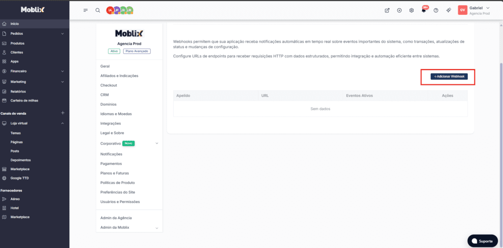 Configurações Webhook Moblix: Passo a passo para receber notificações instantâneas Leitura estimada: 2 minutos 282 views Com os Webhooks Moblix, você recebe notificações automáticas instantâneas no seu sistema sempre que algo importante acontecer: novos pedidos de passagens, reservas de hospedagem confirmadas, pacotes turísticos cancelados e muito mais! Integre com ferramentas internas, automatize processos e fique 100% no controle, sem perder um pedido, atualização ou cadastro na sua agência. É eficiência pura para você focar no que realmente importa: vender! Passo a Passo para configurar o Webhook: 1. Faça login no Painel Moblix com seu e-mail e senha. 2. No menu superior, clique em Configurações (ícone de engrenagem), e selecione a Aba ‘’Integrações”. 3. Acesse a Seção de Gerenciamento de Webhooks e clique em Adicionar Webhook. 4. Dê um Apelido ao Webhook. No campo Apelido, digite um nome fácil de identificar (ex: “Meu Sistema de Pedidos”). 5. Cole a URL do Seu Endpoint. Em URL, insira o link do sistema que receberá as notificações. Você pode usar qualquer plataforma (Zapier, Make, etc.) para criar esse endpoint. 6. Escolha e marque os eventos que deseja monitorar dentre as opções: – ✅ Pedido recebido – ✅ Pedido em andamento – ✅ Pedido finalizado – ✅ Pedido cancelado – ✅ Cliente cadastrado 7. Para finalizar a configuração, clique em Adicionar, revise os dados e depois clique em Salvar. Pronto! Seu webhook está ativo. Dica Pro: Antes de usar na prática, teste seu webhook com o Webhooks.site no seguinte link: https://webhook.site/#!/view/6446b486-78f9-4983-a23b-a8efb7ec9232 Ele gera um URL temporário onde você visualiza exatamente como os dados chegam. É perfeito para ajustes sem afetar seu sistema real. Se tiver qualquer dúvida ou encontrar algum problema, entre em contato com nossa equipe de Suporte. Para outros artigos como esse, acesse nossa Central de Atendimento. Aproveite sua jornada com a Moblix!