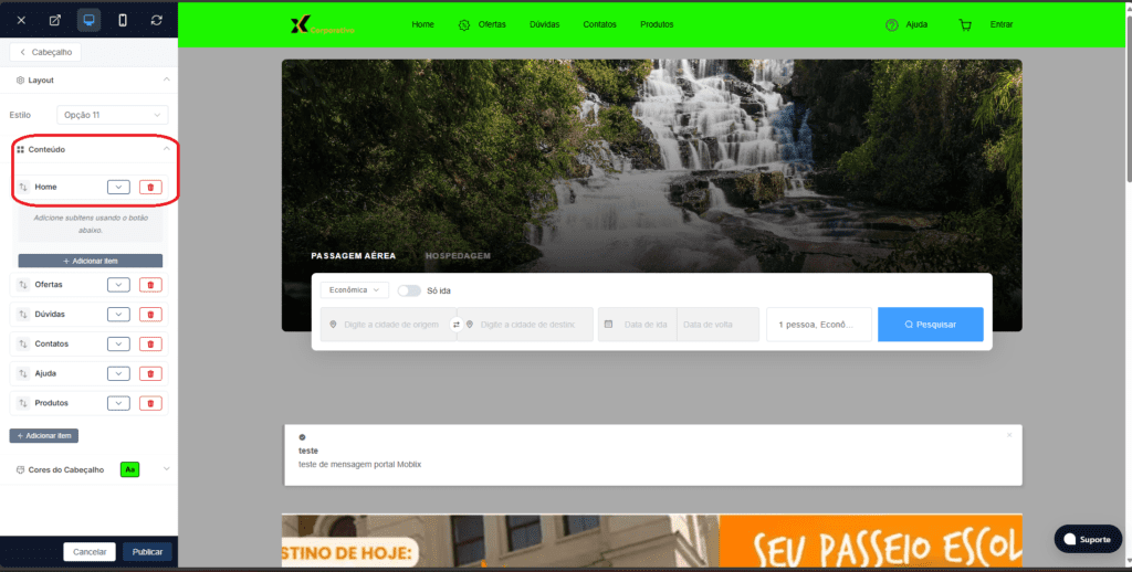 Minha conta Como criar menus no seu site da plataforma Moblix Leitura estimada: 2 minutos 694 views Como criar menus no seu site da plataforma Moblix. A Moblix vem implementando com frequência novas atualizações com recursos novos e úteis para o seu site. A mais recente são os menus customizáveis que a agência pode cadastrar. Esses menus com links podem ser: Páginas internas, como blog, banners e etc. Sites externos que a agência possui ou deseja publicar. Acesse o seu painel 1- Na aba Loja Virtual -> Temas -> Personalizar Layout . Nessa parte consegue configurar o layout do seu site, é aqui que pode customizar os menus. 2- Na aba de clique em “Cabeçalho”. 3. Na aba de cabeçalho, clique em conteúdo para criar um menu. Irá abrir uma pequena aba, clique em Adicionar Item para inserir um link de submenu. 4- Na aba de criar o menu, você coloca o nome do menu(como irá aparecer no site), e o link que o cliente será redirecionado ao clicar. 5- Para excluir um submenu basta clica no ícone de cor vermelha do site. PRONTO! Agora, seu site está com vários submenus cadastrados. Em caso de dúvidas não deixe de entrar em contato com nosso Suporte. Para mais artigos como esse acesse nossa Central de Atendimento. Marcado:LayoutMenuPlataforma Moblix